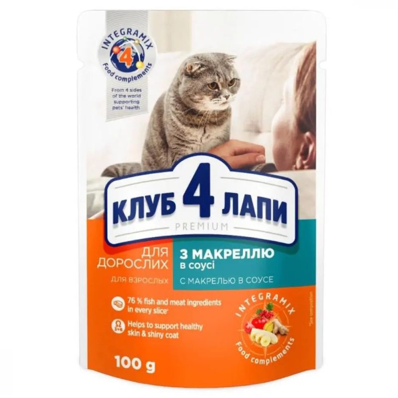 Главная страница » Магазин » Клуб 4 Лапы Premium с макрелью в соусе для кошек 24х100 г