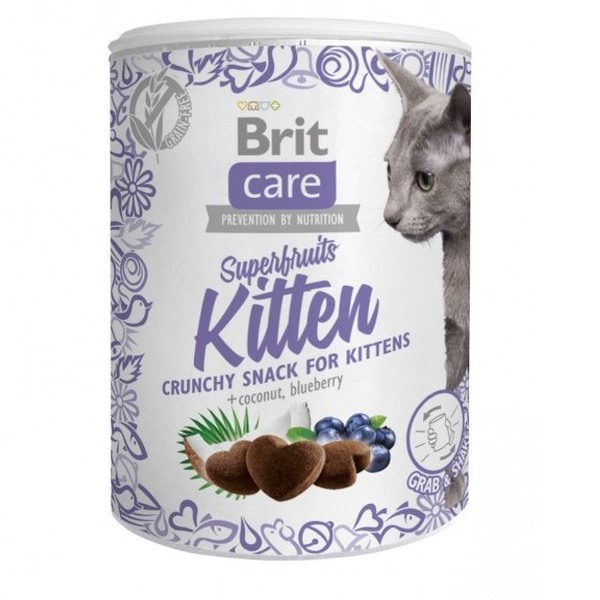 Brit Care Superfruits Kitten Chicken, Coconut & Blueberry 100 г — натуральное лакомство для котят от 6 недель с курицей, кокосом и черникой, полезное поощрение с суперфруктами для поддержания роста и развития питомца.