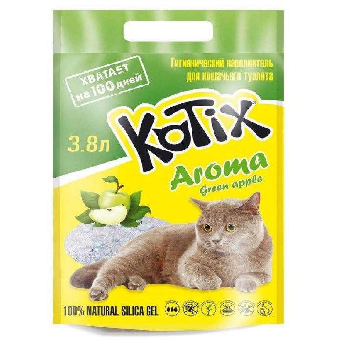 Kotix Green Apple 3,8 л — практичный выбор для владельцев, которые хотят купить силикагелевый наполнитель для кошачьего туалета с ароматом зелёного яблока в удобной компактной упаковке.