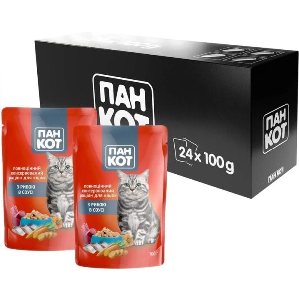 Пан Кот Рыба — влажный корм для кошек, предназначенный для ежедневного питания взрослых животных. Рецептура основана на рыбе и продуктах животного происхождения, что обеспечивает поступление животного белка в легкоусвояемой форме. Корм приготовлен в рыбном соусе, который придаёт мягкую текстуру и способствует комфортному поеданию. Упаковка 24×100 г удобна для регулярного использования и точного контроля порций.